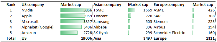 The fifth-largest US Big Tech company, Amazon, has double the market capitalization of Europe’s entire top 5. The largest Asian company is also bigger than the European top 5 combined.