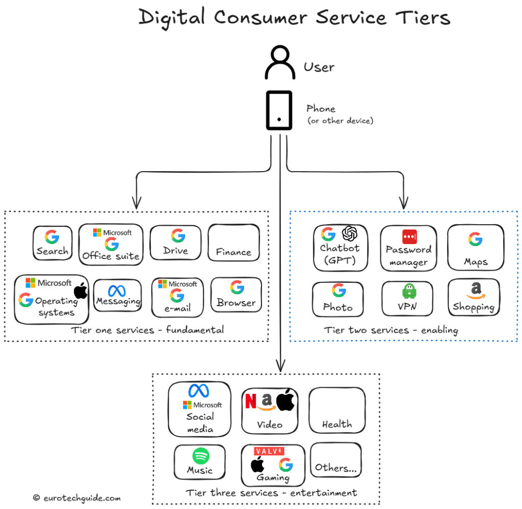 In another, I wrote about why it is important to have European tech. There are two main reasons: countries are becoming more inward-focused and the entanglement of Big Tech and politics is increasing. Access to digital consumer services is becoming a geopolitical bargaining chip and Europe is vulnerable. It is obvious that the EU and national governments have an important role to play in nurturing the growth of European solutions. However, as European consumers we should start using European solutions, so they can grow. Europeans spend over €300 billion per year on US Big Tech. Redirecting 10%, or even a lower share, of that amount towards European digital consumer services, would be an enormous boost.